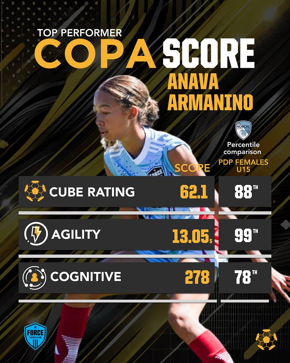A De Anza Force ECNL standout, Anava’s creativity and 1v1 ability are supported by top-percentile agility and strong problem-solving metrics when compared to elite players above her age group, confirming her ability to break pressure and unlock defenses. With a recent USYNT Talent ID invite and a standout performance at COPA’s Talent ID Day in July 2025, she’s emerging as one of NorCal’s top young playmakers.