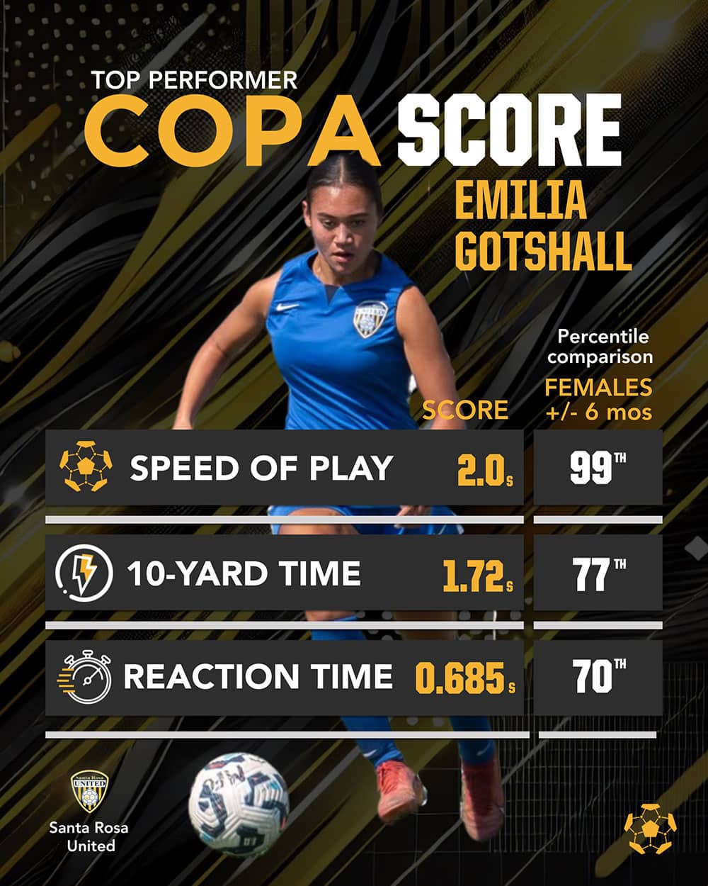 A standout attacker for Santa Rosa United ECNL and Casa Grande HS, Emmy excels in breaking pressure and finding final passes. Her top-percentile speed-of-play reflects her ability to operate quickly in tight areas. Another athlete leveraging the COPA Score every 4 months as part of her development, she’s continuously improving. With WPSL experience already under her belt, and attendance at COPA’s Talent ID Days in 2025, she’s preparing for the college game.